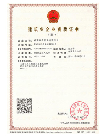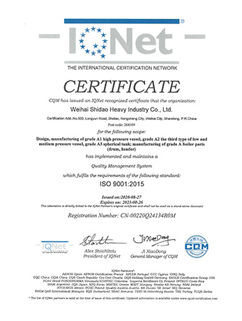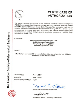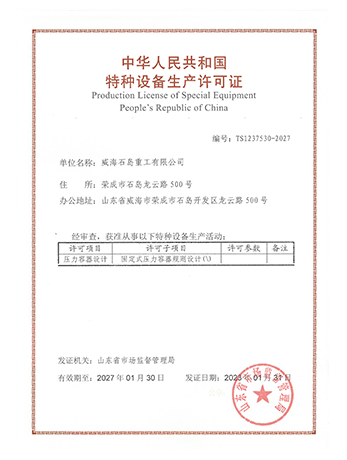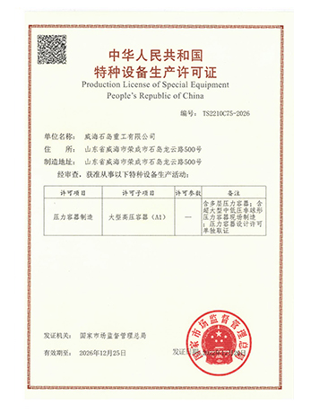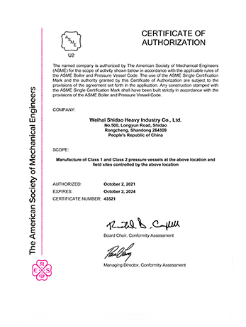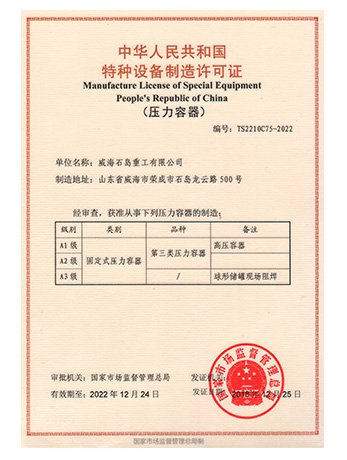 威海石岛重工有限公司秉承了泰山集团悠久的锅炉压力容器制造经验,相继取得了国家正式颁发的A1、A2、A3类压力容器制造和设计许可证。随着产品的外向发展,获得了美国ASME认证。