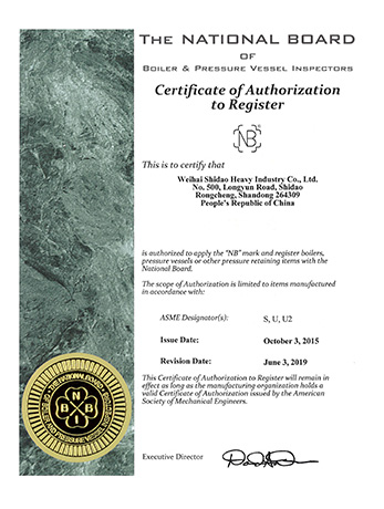 Weihai Shidao Heavy Industry Co., Ltd. inherits Mount Taishan Group's long experience in manufacturing boiler and pressure vessels, and has successively obtained the manufacturing and design licenses for A1, A2 and A3 pressure vessels officially issued by the state. With the outward development of the product, it has obtained ASME certification in the United States.