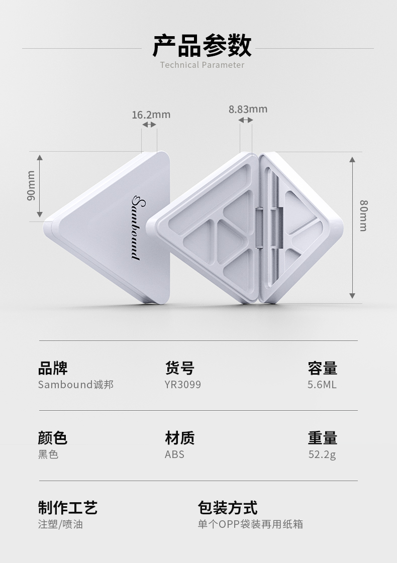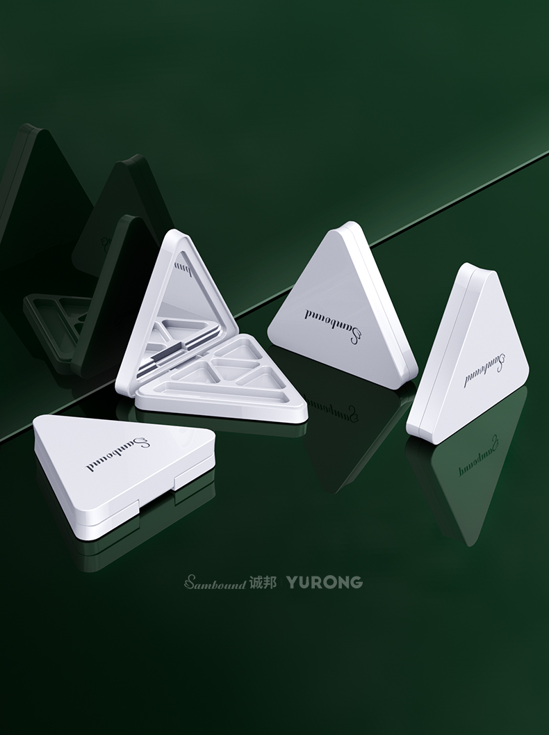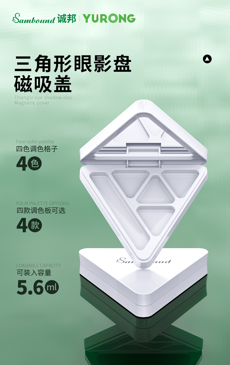 這款三角形磁吸眼影盤特點:獨特的三角形外觀、磁吸開關設計、可定制logo圖案