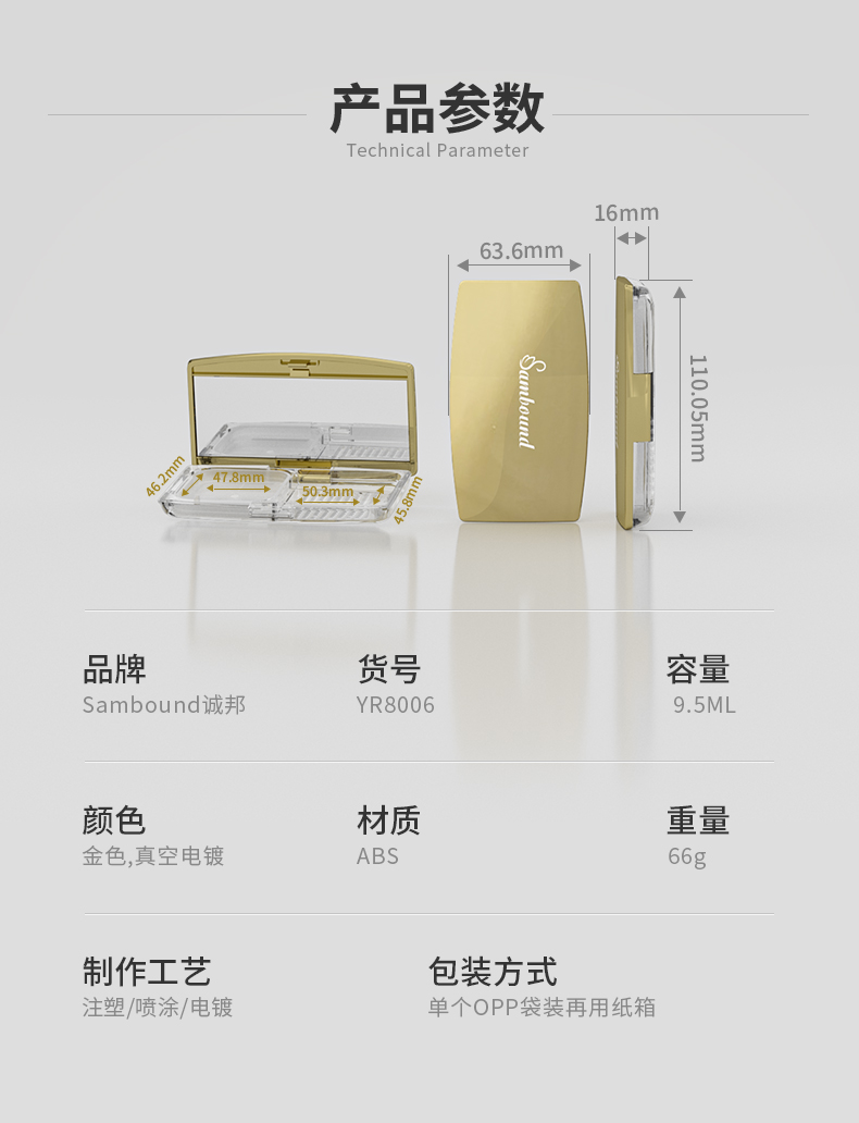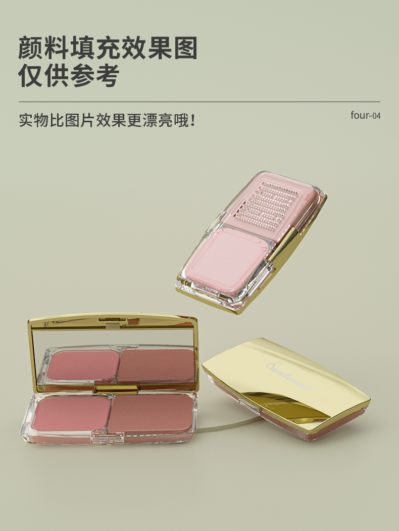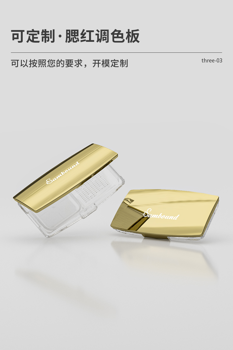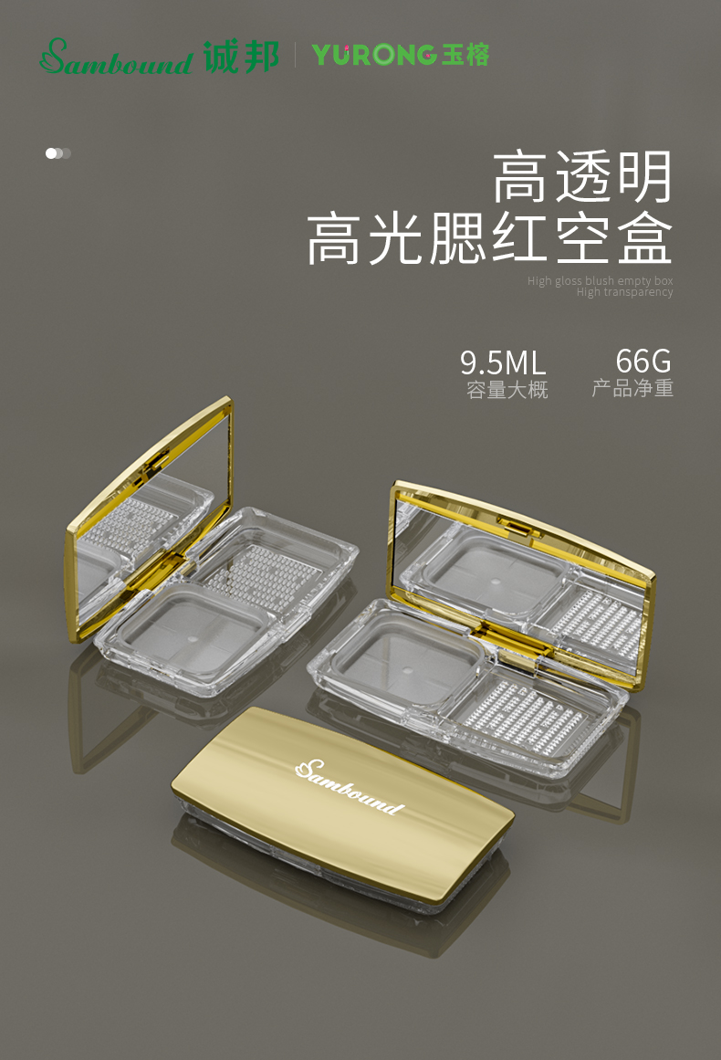 高透明高光腮紅盒,采用ABS和AS料,表面蓋子真空電鍍,也可以按需定制顏色、logo等,東莞誠邦化妝品包材是一家成立2010年的彩妝包材注塑價格廠家,國內外3家分廠。