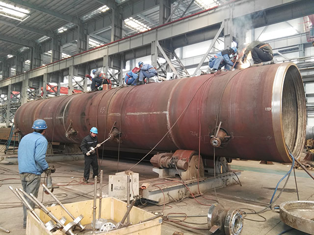2月8日,装车完毕等待发货的设备是石岛重工为山东德州某公司生产的用于化工方面的汽提塔设备。